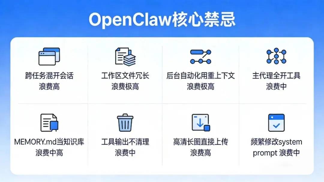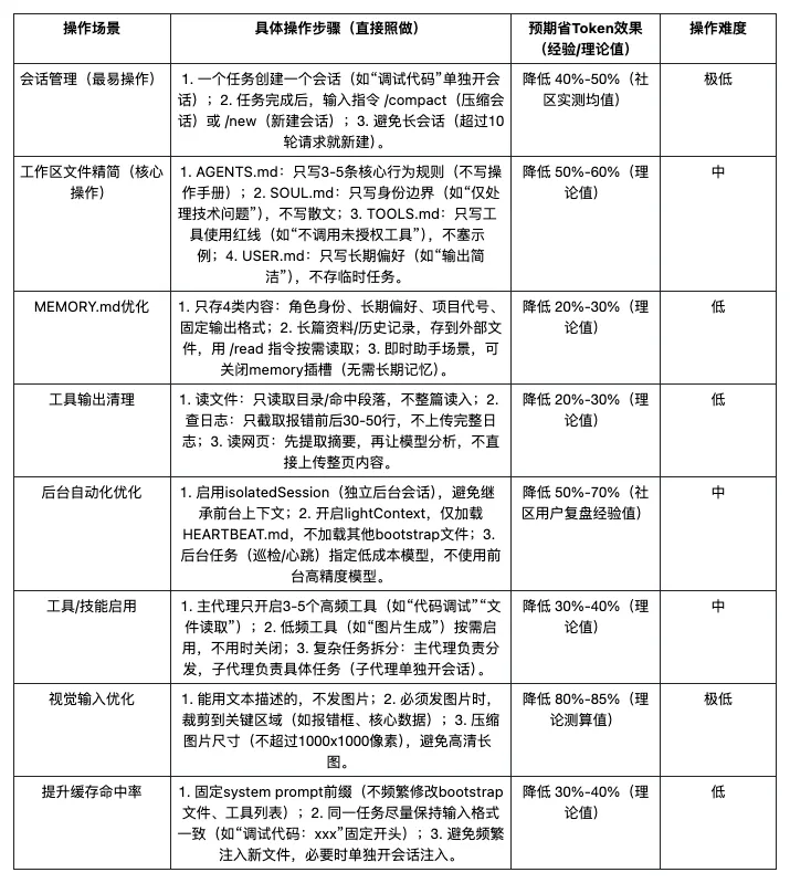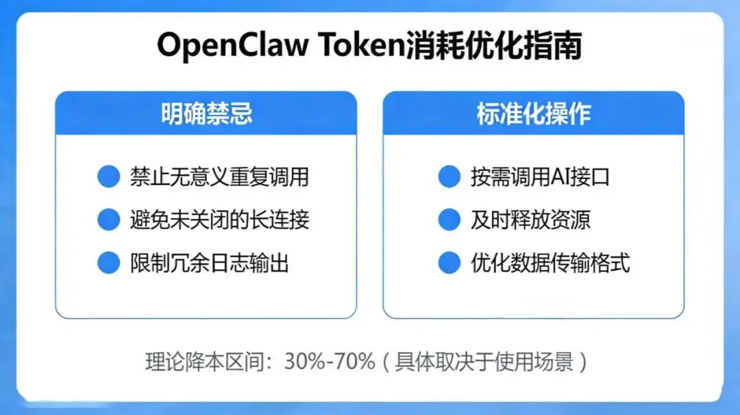 无需复杂配置,通过「明确禁忌+标准化操作」,快速降低 OpenClaw Token 消耗,核心聚焦「减少无效token占用、避免隐性浪费」。实操落地后,理论降本区间为 30%-70%,具体取决于使用场景。