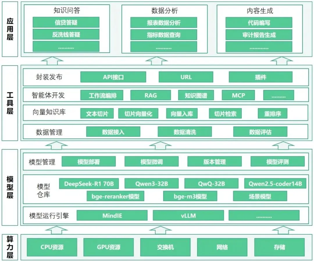 在此背景下,陕西农信积极探索大模型技术的工程化、规模化落地路径。针对中小金融机构普遍面临的模型适配成本高、领域知识融合难等问题,以“自主可控、分层解耦、模块化设计”的建设思路,构建涵盖算力、模型、工具、应用四个层级的大模型平台,整合高性能算力资源与先进AI技术,并基于DeepSeek、Qwen等主流开源大模型,通过检索增强生成、知识图谱、意图分析、实体识别等多技术综合应用在不同业务领域构建智能化应用,实现从通用大模型向专业化、场景化智能服务的转化。将大模型能力与具体业务场景深度融合,应用于日常办公、信贷、审计、客服、反洗钱等多个业务场景,显著提升陕西农信经营管理质效及风险防控能力。
