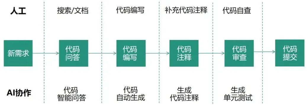 基于开源的Qwen2.5-Coder等大模型,通过在IDE中集成代码辅助插件,在编码界面实现上下文感知的代码生成、代码检查与代码解释等功能。同时,以信息系统需求文档和操作界面为输入,自动提取、归纳形成测试点并批量生成测试用例和测试脚本,大幅度提升测试效率,有效降低研发人力成本。AI辅助代码编写包括代码问答、代码编写、代码注释、代码审查等,流程如下图2所示。