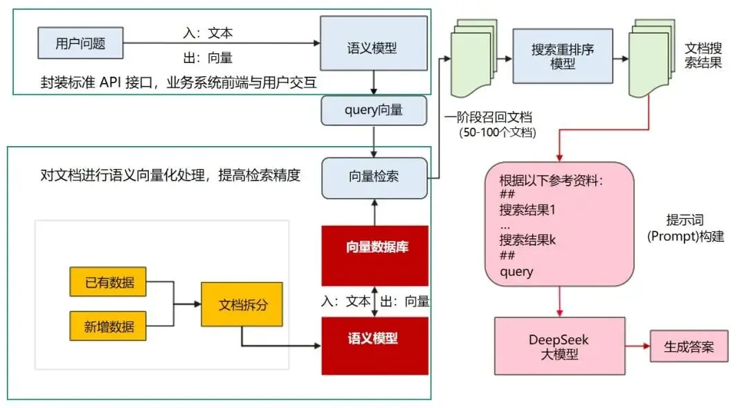 传统的文档检索基于词频统计,存在语义理解局限,难以有效处理同义词替换、上下文关联等复杂场景。为此,我们通过DeepSeek大模型拆分策略和拆分模型将用户上传文档进行拆分处理,之后向量数据库将文档片段通过语义模型进行向量化后进行存储。在用户通过智能助手进行询问时,搜索模块从向量数据库中匹配到语义最接近的文档或者文本块,并结合混合检索等技术进行相关度排序,最后大模型将搜索的结果+原始查询语句通过大模型进行归纳总结,生成回答。在信贷申请及审批、反洗钱监测、普惠金融服务等复杂业务领域落地应用,实现了从传统的“信息检索”到“认知决策”的跨越。具体流程如下图5所示。