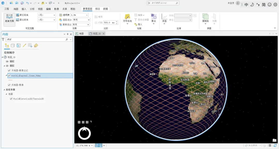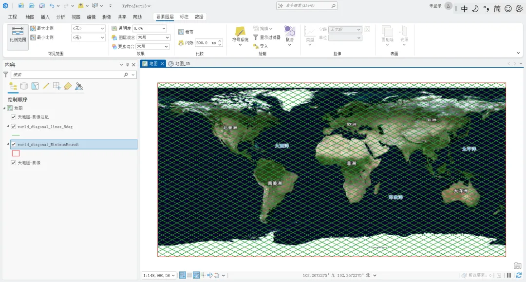 import arcpyimport os# 设置工作空间desktop = os.path.join(os.path.expanduser("~"), "Desktop", "GIS")os.makedirs(desktop, exist_ok=True)arcpy.env.workspace = desktoparcpy.env.overwriteOutput = True# 输出路径output_path = os.path.join(arcpy.env.workspace, "world_diagonal_lines_5deg.shp")# 第一条线:从 (-180, -90) 到 (180, 90)# 斜率 = (90 - (-90)) / (180 - (-180)) = 180 / 360 = 0.5# 方程:lat = 0.5 * lon + b# 第一条线通过 (-180, -90):-90 = 0.5 * (-180) + b => b = 0# 所以第一条线:lat = 0.5 * lon# 平行线间距:5 度(纬度方向偏移)lat_offset = 5# 删除已存在的文件if arcpy.Exists(output_path): arcpy.Delete_management(output_path) print("已删除旧文件")# 创建线要素类arcpy.CreateFeatureclass_management( out_path=arcpy.env.workspace, out_name="world_diagonal_lines_5deg.shp", geometry_type="POLYLINE", spatial_reference=arcpy.SpatialReference(4326) # WGS84)# 添加字段arcpy.AddField_management(output_path, "jd", "DOUBLE")arcpy.AddField_management(output_path, "wd", "DOUBLE")arcpy.AddField_management(output_path, "offset", "DOUBLE")arcpy.AddField_management(output_path, "direction", "TEXT", field_length=10)print("要素类已创建,开始添加对角线...")# 计算线与地球边界的交点def calc_line_points(slope, b):"""计算斜线与地球边界的交点"""points = []# 左边界 (lon = -180): lat = slope * (-180) + blat_left = slope * (-180) + bif -90 <= lat_left <= 90: points.append((-180, lat_left))# 右边界 (lon = 180): lat = slope * 180 + blat_right = slope * 180 + bif -90 <= lat_right <= 90: points.append((180, lat_right))# 下边界 (lat = -90): lon = (-90 - b) / slopeif slope != 0: lon_bottom = (-90 - b) / slopeif -180 <= lon_bottom <= 180: points.append((lon_bottom, -90))# 上边界 (lat = 90): lon = (90 - b) / slopeif slope != 0: lon_top = (90 - b) / slopeif -180 <= lon_top <= 180: points.append((lon_top, 90))# 去重并排序points = list(set(points))if len(points) >= 2: points.sort(key=lambda p: p[0])return points# 使用插入游标添加要素with arcpy.da.InsertCursor(output_path, ["SHAPE@", "jd", "wd", "offset", "direction"]) as cursor: line_count = 0# ========== 第一组:从 (-180, -90) 到 (180, 90),斜率 0.5 ==========print("正在生成第一组对角线(左下→右上)...") slope1 = 0.5for b in range(-180, 181, lat_offset): points = calc_line_points(slope1, b)if len(points) >= 2: array = arcpy.Array([arcpy.Point(lon, lat) for lon, lat in points]) polyline = arcpy.Polyline(array, arcpy.SpatialReference(4326)) mid_lon = (points[0][0] + points[-1][0]) / 2mid_lat = (points[0][1] + points[-1][1]) / 2cursor.insertRow([polyline, mid_lon, mid_lat, b, "NE-SW"]) line_count += 1# ========== 第二组:从 (-180, 90) 到 (180, -90),斜率 -0.5 ==========print("正在生成第二组对角线(左上→右下)...") slope2 = -0.5# 第二条线通过 (-180, 90):90 = -0.5 * (-180) + b => b = 0for b in range(-180, 181, lat_offset): points = calc_line_points(slope2, b)if len(points) >= 2: array = arcpy.Array([arcpy.Point(lon, lat) for lon, lat in points]) polyline = arcpy.Polyline(array, arcpy.SpatialReference(4326)) mid_lon = (points[0][0] + points[-1][0]) / 2mid_lat = (points[0][1] + points[-1][1]) / 2cursor.insertRow([polyline, mid_lon, mid_lat, b, "NW-SE"]) line_count += 1# 统计结果result_count = int(arcpy.GetCount_management(output_path)[0])# 分别统计两组线layer1 = arcpy.SelectLayerByAttribute_management(output_path, "NEW_SELECTION", "direction = 'NE-SW'")count1 = int(arcpy.GetCount_management(layer1)[0])layer2 = arcpy.SelectLayerByAttribute_management(output_path, "NEW_SELECTION", "direction = 'NW-SE'")count2 = int(arcpy.GetCount_management(layer2)[0])arcpy.SelectLayerByAttribute_management(output_path, "CLEAR_SELECTION")print(f"\n[OK] 文件已生成:{output_path}")print(f"[OK] 对角线总数:{result_count} 条")print(f"[OK] 第一组(左下→右上):{count1} 条,斜率 0.5,第一条线:(-180, -90) 到 (180, 90)")print(f"[OK] 第二组(左上→右下):{count2} 条,斜率 -0.5,第一条线:(-180, 90) 到 (180, -90)")print(f"[OK] 平行线间距:{lat_offset} 度(纬度方向)")print(f"[OK] 字段:jd (经度), wd (纬度), offset (截距), direction (方向)")print(f"[OK] 坐标系统:EPSG:4326 (WGS84)")