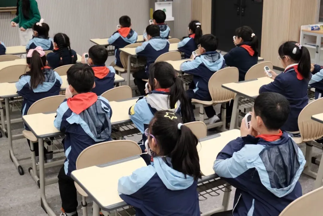 三年级现场实操后,活动播放六年级人机对话实操视频,从低段现场实操到高段视频观摩,全方位呈现 AI语伴答题器在教学各学段的落地应用。