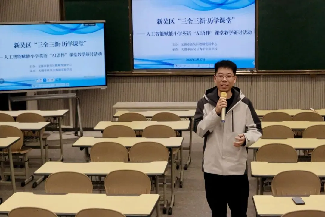 为深耕人工智能与小学英语课堂的深度融合,落实“三全三新・历学课堂”,2026年3月27日下午,人工智能赋能小学英语“AI语伴”课堂研讨活动在新吴区春阳实验学校顺利开展。活动包含课堂实操、案例展示、专家讲座、专业总结,全方位呈现AI语伴在英语教学全流程的应用实践,为全区英语教师搭建交流学习的优质平台,推动数智技术赋能英语教学。