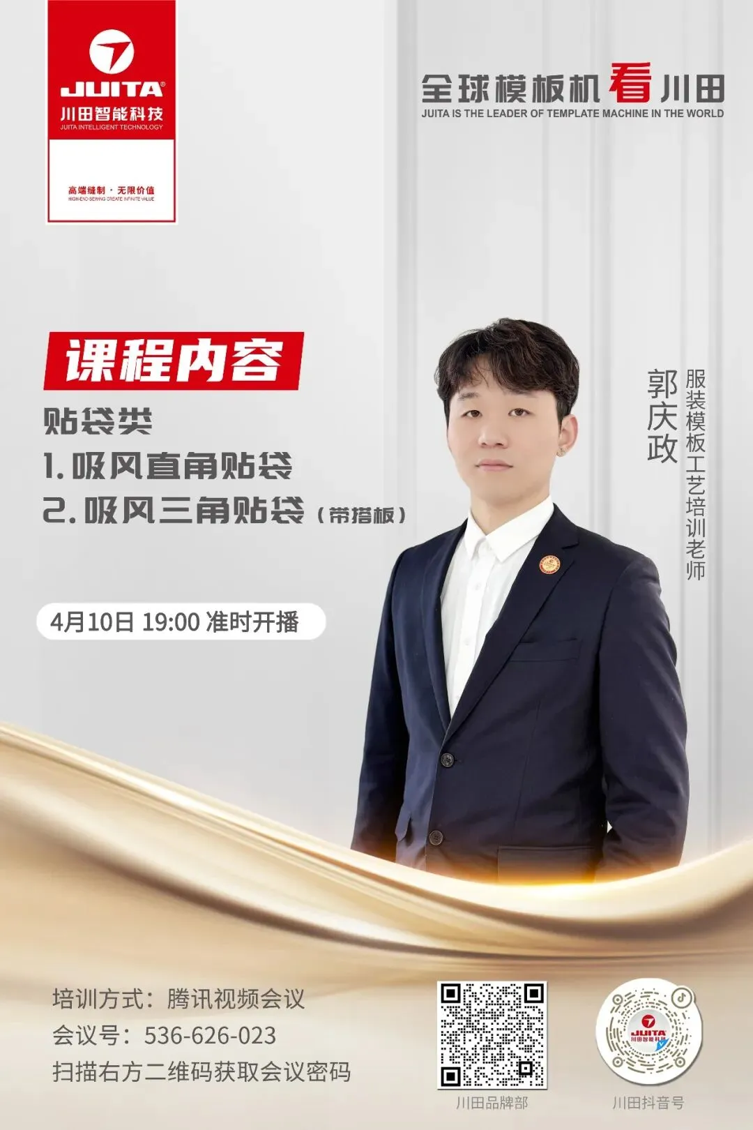 培训预告 今天晚上19:00 模板工艺直播培训 不见不散!!!四月第一次线上培训倒计时!!现将具体内容给大家提前预告一波~【重点来啦】一、时 间2026年4月10日 19:00—21:00二、地 点腾讯会议直播间会议号:536-626-023会议密码:扫描下方二维码即可获取三、课程内容1.吸风直角贴袋 2.吸风三角贴袋(带搭板)四、培训讲师川田服装模板工艺培训老师郭庆政五、参加人员面向每一个热爱学习的你2026年4月10日(周五)19:00—21:00 我们不见不散哦~END