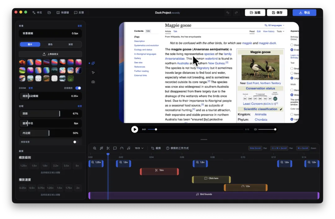 Recordly 可以根据操作自动强调重点区域,平滑光标运动,添加动态效果,并将最终画面放进带有壁纸、纯色、渐变、模糊、留白和阴影的样式化边框中。