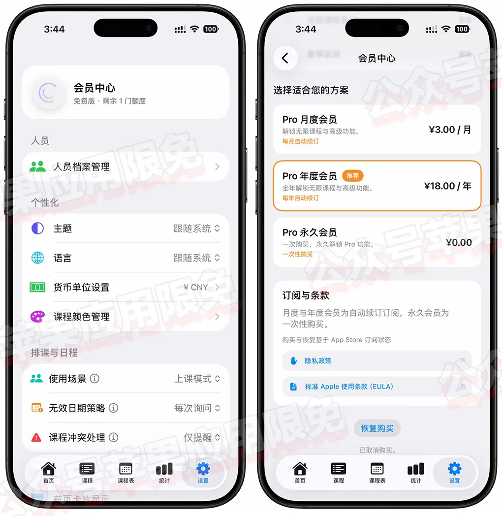 一款课时记录与自动打卡软件,目前可以免费获取它的终身会员,打开软件从设置进入内购,永久显示0即可免费获取,设备需装有 iOS 17.0 或更高版本。