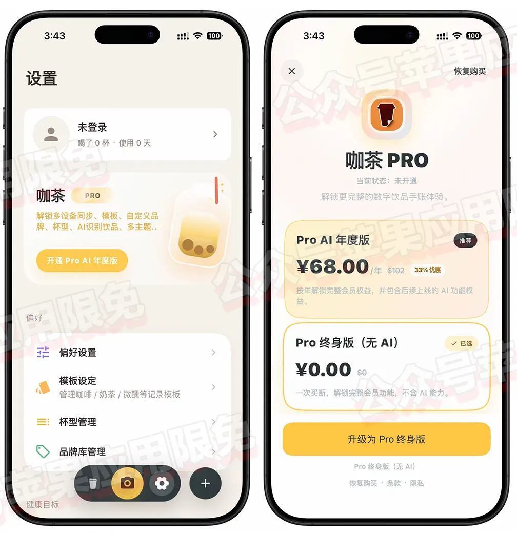 一款手帐风格的饮品记录软件,目前可以免费获取它的终身无AI终身版,打开软件从设置进入内购,终身显示0即可免费获取。设备需装有 iOS 14.0 或更高版本。