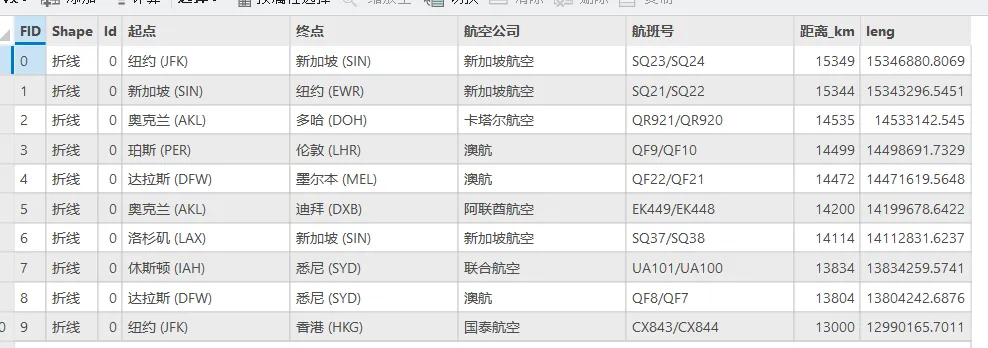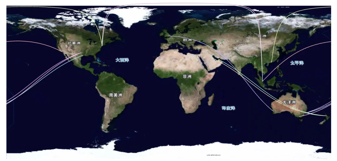import arcpyimport os# 设置工作空间desktop = os.path.join(os.path.expanduser("~"), "Desktop")gis_folder = os.path.join(desktop, "GIS")os.makedirs(gis_folder, exist_ok=True)arcpy.env.workspace = gis_folderarcpy.env.overwriteOutput = True# 输出路径output_path = os.path.join(gis_folder, "航线.shp")# 机场坐标(纬度,经度)airports = {"JFK": {"name": "纽约 (JFK)", "lat": 40.6413, "lon": -73.7781},"EWR": {"name": "纽约 (EWR)", "lat": 40.6895, "lon": -74.1745},"SIN": {"name": "新加坡 (SIN)", "lat": 1.3644, "lon": 103.9915},"AKL": {"name": "奥克兰 (AKL)", "lat": -37.0082, "lon": 174.7850},"DOH": {"name": "多哈 (DOH)", "lat": 25.2609, "lon": 51.6138},"PER": {"name": "珀斯 (PER)", "lat": -31.9403, "lon": 115.9672},"LHR": {"name": "伦敦 (LHR)", "lat": 51.4700, "lon": -0.4543},"DFW": {"name": "达拉斯 (DFW)", "lat": 32.8998, "lon": -97.0403},"MEL": {"name": "墨尔本 (MEL)", "lat": -37.6690, "lon": 144.8410},"DXB": {"name": "迪拜 (DXB)", "lat": 25.2532, "lon": 55.3657},"LAX": {"name": "洛杉矶 (LAX)", "lat": 33.9416, "lon": -118.4085},"IAH": {"name": "休斯顿 (IAH)", "lat": 29.9902, "lon": -95.3368},"SYD": {"name": "悉尼 (SYD)", "lat": -33.9399, "lon": 151.1753},"HKG": {"name": "香港 (HKG)", "lat": 22.3080, "lon": 113.9185}}# 航线列表(起点,终点,航空公司,航班号,距离)routes = [ ("JFK", "SIN", "新加坡航空", "SQ23/SQ24", 15349), ("SIN", "EWR", "新加坡航空", "SQ21/SQ22", 15344), ("AKL", "DOH", "卡塔尔航空", "QR921/QR920", 14535), ("PER", "LHR", "澳航", "QF9/QF10", 14499), ("DFW", "MEL", "澳航", "QF22/QF21", 14472), ("AKL", "DXB", "阿联酋航空", "EK449/EK448", 14200), ("LAX", "SIN", "新加坡航空", "SQ37/SQ38", 14114), ("IAH", "SYD", "联合航空", "UA101/UA100", 13834), ("DFW", "SYD", "澳航", "QF8/QF7", 13804), ("JFK", "HKG", "国泰航空", "CX843/CX844", 13000)]# 删除已存在的文件if arcpy.Exists(output_path): arcpy.Delete_management(output_path) print("已删除旧文件")# 创建线要素类arcpy.CreateFeatureclass_management( out_path=gis_folder, out_name="航线.shp", geometry_type="POLYLINE", spatial_reference=arcpy.SpatialReference(4326) # WGS84)# 添加字段arcpy.AddField_management(output_path, "起点", "TEXT", field_length=50)arcpy.AddField_management(output_path, "终点", "TEXT", field_length=50)arcpy.AddField_management(output_path, "航空公司", "TEXT", field_length=50)arcpy.AddField_management(output_path, "航班号", "TEXT", field_length=50)arcpy.AddField_management(output_path, "距离_km", "DOUBLE")print("要素类已创建,开始绘制航线...")# 使用插入游标添加要素with arcpy.da.InsertCursor(output_path, ["SHAPE@", "起点", "终点", "航空公司", "航班号", "距离_km"]) as cursor:for start_code, end_code, airline, flight_num, distance in routes: start = airports[start_code] end = airports[end_code]# 创建测地线(大圆航线)# 使用 densify 方法沿大圆路径加密点array = arcpy.Array([ arcpy.Point(start["lon"], start["lat"]), arcpy.Point(end["lon"], end["lat"]) ])# 创建测地线(考虑地球曲率)polyline = arcpy.Polyline( array, arcpy.SpatialReference(4326), has_z=False, has_m=False)# 沿测地线加密点(每 500 公里一个点,使曲线更平滑)# 使用 geodesic 方法生成大圆路径num_points = int(distance / 500) + 2densified_line = polyline.densify("GEODESIC", num_points)# 插入记录cursor.insertRow([ densified_line, start["name"], end["name"], airline, flight_num, distance ]) print(f" 已绘制:{start['name']} → {end['name']} ({distance} km)")# 统计结果result_count = int(arcpy.GetCount_management(output_path)[0])print(f"\n[OK] 文件已生成:{output_path}")print(f"[OK] 航线数量:{result_count} 条")print(f"[OK] 坐标系统:EPSG:4326 (WGS84)")print(f"[OK] 字段:起点,终点,航空公司,航班号,距离_km")print(f"\n航线列表:")for i, (start_code, end_code, airline, flight_num, distance) in enumerate(routes, 1): start = airports[start_code] end = airports[end_code] print(f" {i}. {start['name']} → {end['name']} | {airline} {flight_num} | {distance:,} km")
