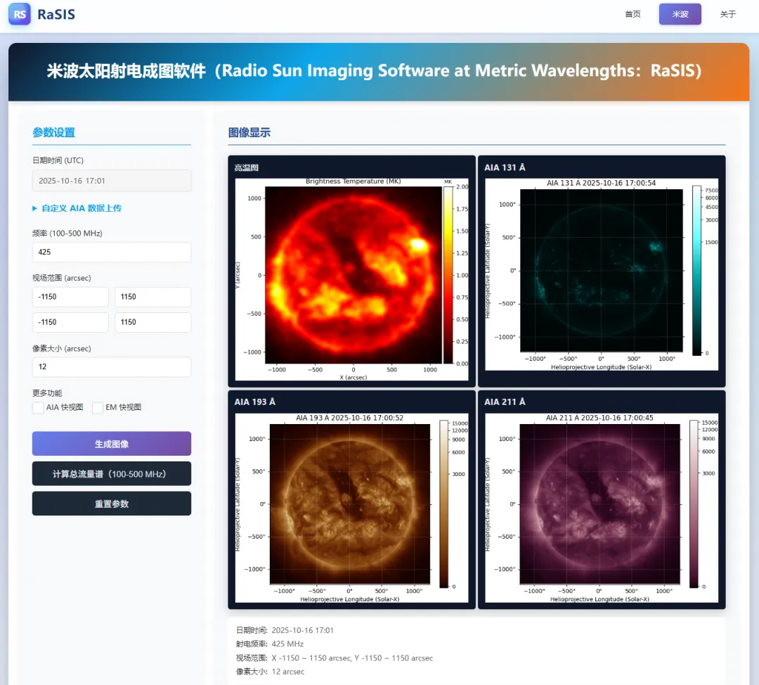 图1:RaSIS米波计算模块主页。用户可在网页端设置计算参数、自动下载或上传 AIA 多波段数据,并生成 100–500 MHz 米波太阳射电亮温图像。