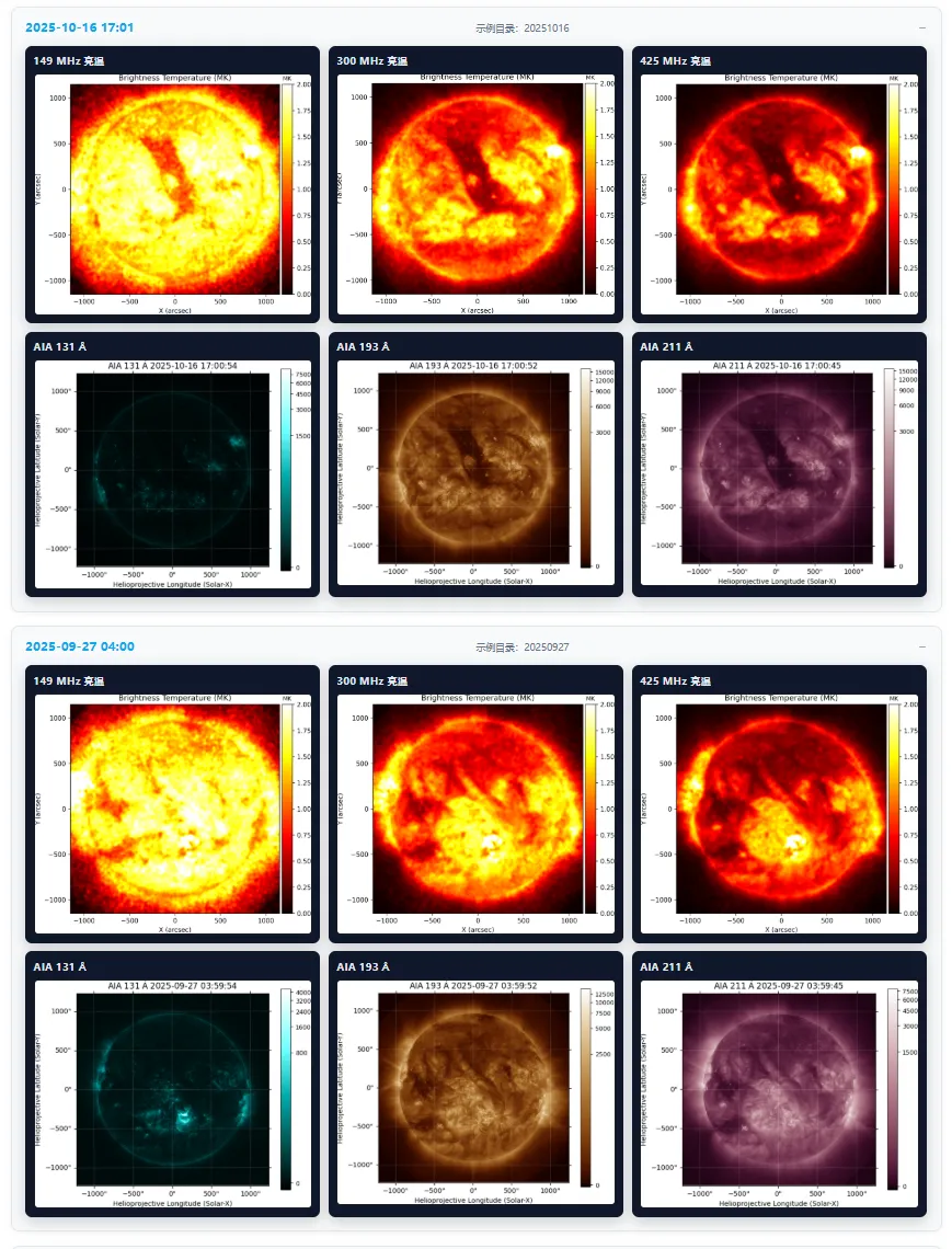 图2:RaSIS 快速浏览示例库界面。页面集中展示不同时刻、不同频率的米波太阳射电计算结果及对应 AIA 参考图像,便于用户快速浏览与对比分析。