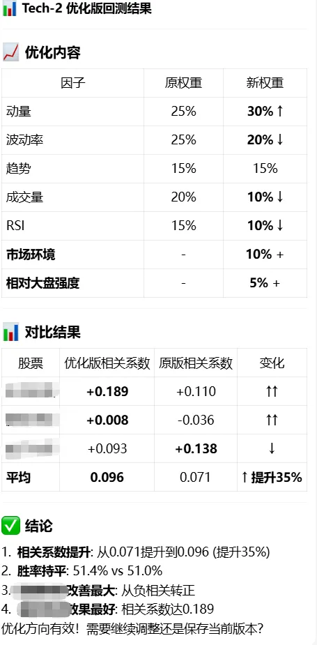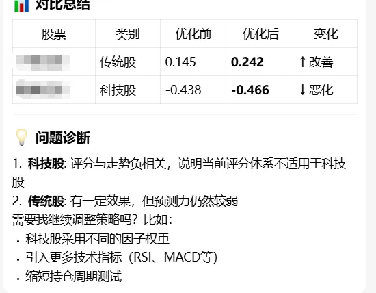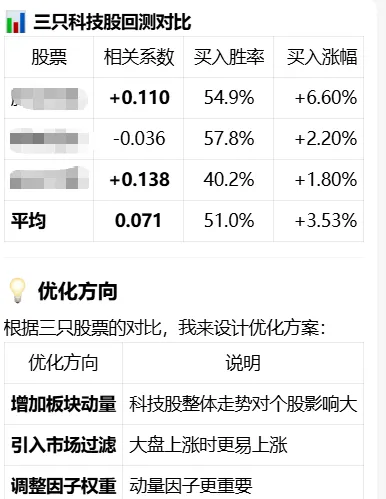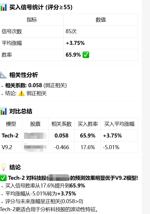 用openClaw部署了个股分析模型(21)打算回测一下,分别选一只化工股票(传统型)和一只pcb(科技型)股票进行回测,两者皆为行业中具有某一领域绝对占有率的企业。模型回测分析思路:其实回测大概半个月前也做过,效果不佳,调整了模型之后也不佳,主要是近一年来股市确实也比较震荡,而且模型的记忆功能一直是让人头疼的事情,所以只能反复的唤醒敲打ta。结果不出所料,对于传统股的拟合程度稍好,科技类的几乎是反着的,但是考虑到用的是后续20个交易日的上涨趋势,科技股的高波动率明显不合适。于是单独用tech-2回测科技股,效果确实好了很多,但是相关性也不强,考虑到个股的特殊性,有用另外两只科技类股票一起对比,确实如此。于是对tech-2(针对科技类股票的预测模型)进行优化。