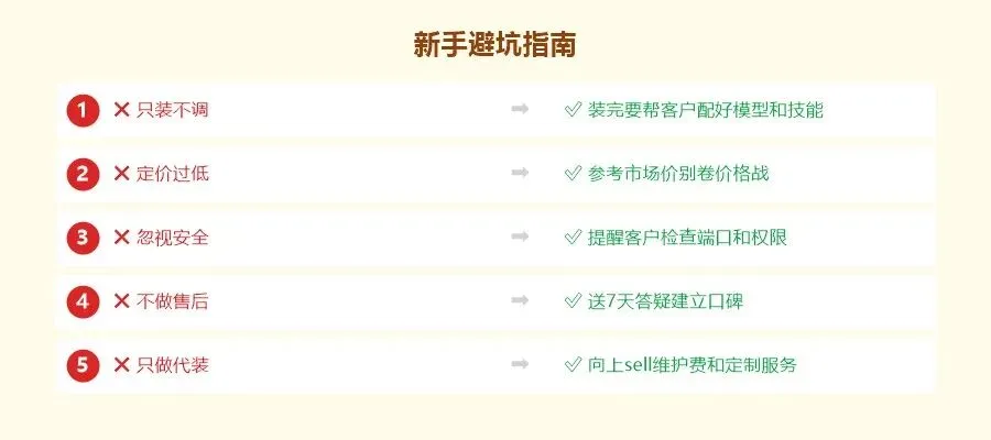 坑5:只做代装不往上走。代装是入口,不是终点。每个装好的客户都是你后续服务的潜在客户——维护费、定制 Skill、企业自动化,这些才是利润大头。