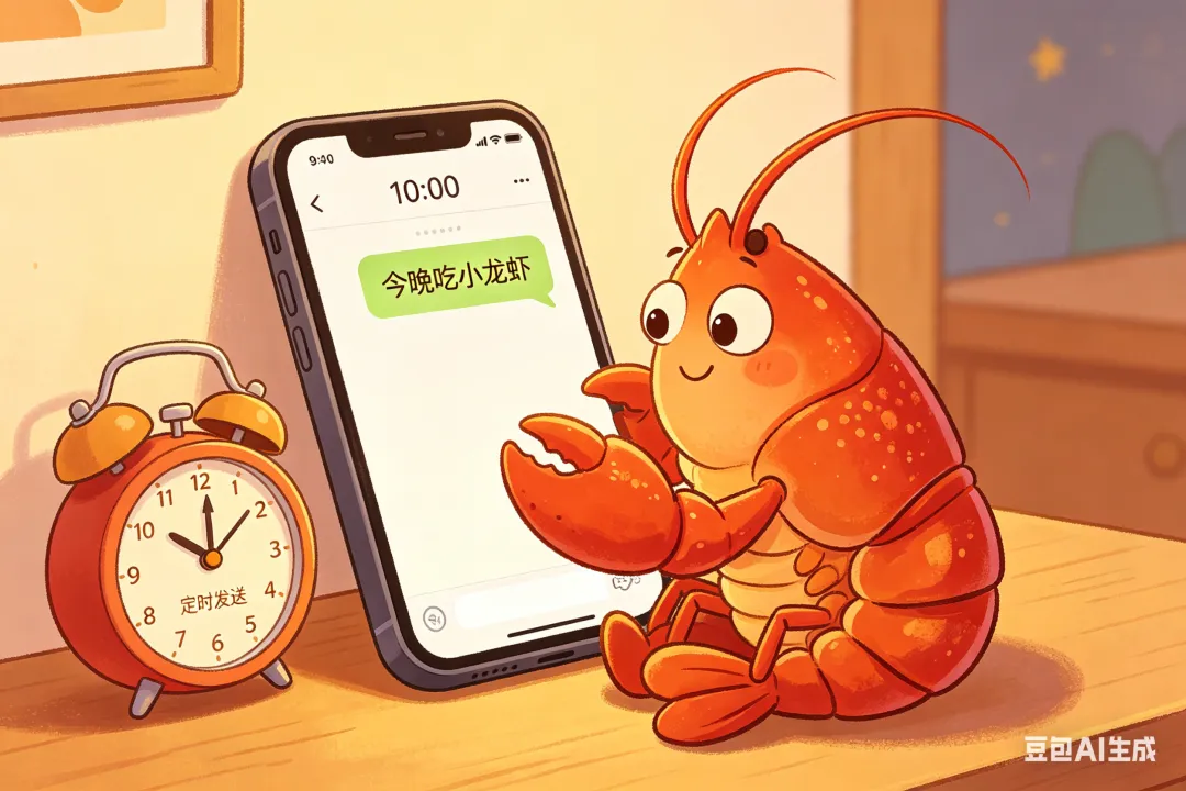 小龙虾能帮你:定时自动发送,支持微信、钉钉、飞书,内容可随机切换,再也不遗漏。