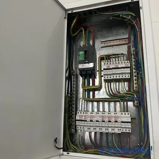 - 隐患描述:图中可见多根导线为黄、绿、红、蓝、黑等颜色,但部分线路未严格遵循“L1(A)、L2(B)、L3(C)相线应为黄、绿、红,N线为淡蓝,PE线为黄绿双色”的规定;例如,部分PE线未采用黄绿双色(如右下角部分线缆呈纯绿色或黄色),存在误接风险,易导致设备外壳带电。