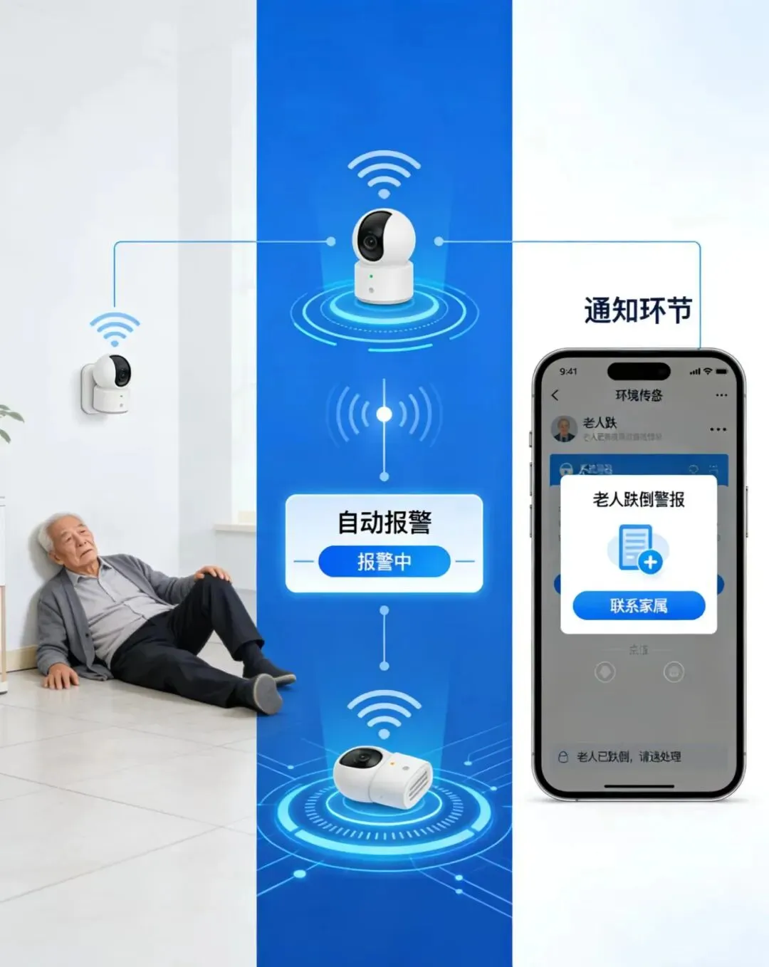 系统通过毫米波雷达、智能传感器、可穿戴设备等智能终端,实现非接触式实时监测,无需老人复杂操作,就能精准捕捉跌倒、久卧不起、突发晕厥等异常状况。一旦发生意外,系统会在3秒内自动触发报警,第一时间通知家属、社区照护人员或急救人员,大幅缩短应急响应时间,让意外得到快速处置。