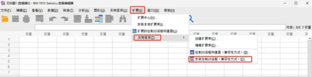 打开SPSS软件,在顶部菜单栏找到扩展(Extensions),依次点击实用程序(Utilities)、安装定制对话框(Install Custom Dialog)。