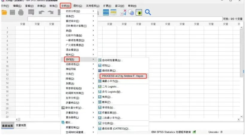 安装完成后,同样在分析、回归菜单下找到PROCESS,验证是否可用。