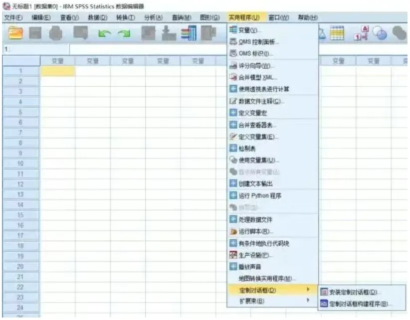 打开SPSS软件,在顶部菜单栏找到实用程序(Utilities),依次点击定制对话框(Custom Dialogs)、安装定制对话框(Install Custom Dialog)。
