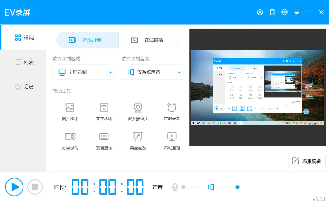 💡 特色功能(免费): 嵌入摄像头(画中画)、定时录制、自定义水印。