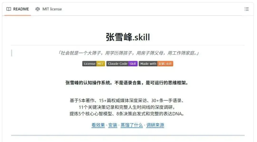 根据技能包网页介绍,开发者基于5本著作、15篇权威媒体深度采访、30多条一手语录、11个关键决策记录和完整的人生时间线深度调研,提炼出5个核心心智模型、8条决策启发式和完整的“表达DNA”。项目强调,其每段回应不是复读语录,而是使用张雪峰的认知框架分析问题。