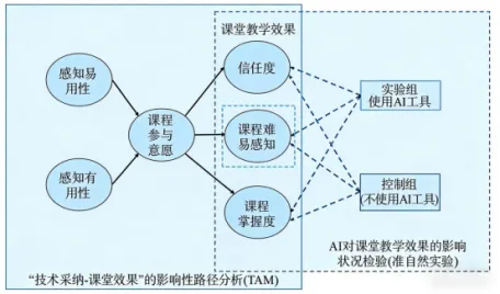 第一,理论层面的深化与拓展。本研究基于技术接纳模型(TAM)进行本土化改造,将课程参与意愿作为中介变量,构建“感知易用性—感知有用性—课程参与意愿—教学效果”的完整路径模型,填补了生成式AI与高校课堂教学效果之间中介机制研究的空白,丰富了教育技术学与人工智能教育的理论体系。