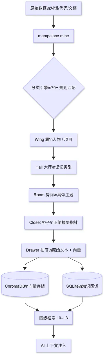 ·全量原始存储:所有对话/代码/文档以原文存入 ChromaDB,不做摘要、不做筛选