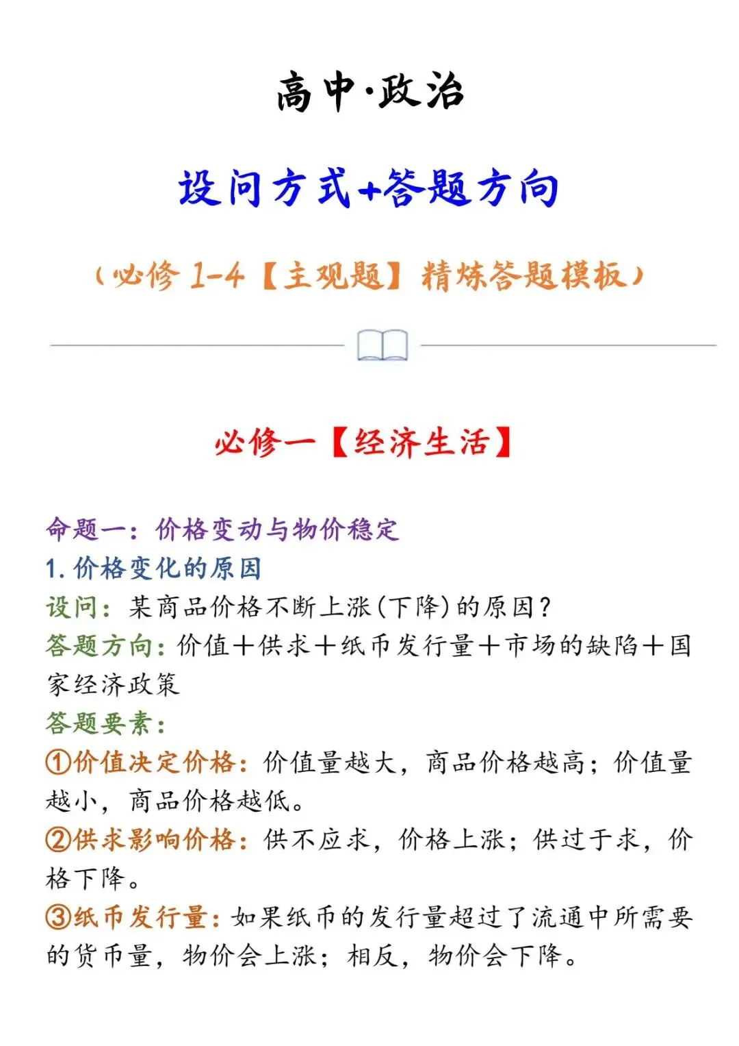 我熬夜整理高中政治必修1-4主观题答题模板,考试可直接套用。基础差,可快速提分;基础强,可强化答题思路,主观题轻松拿下高分,助力政治稳步提分!