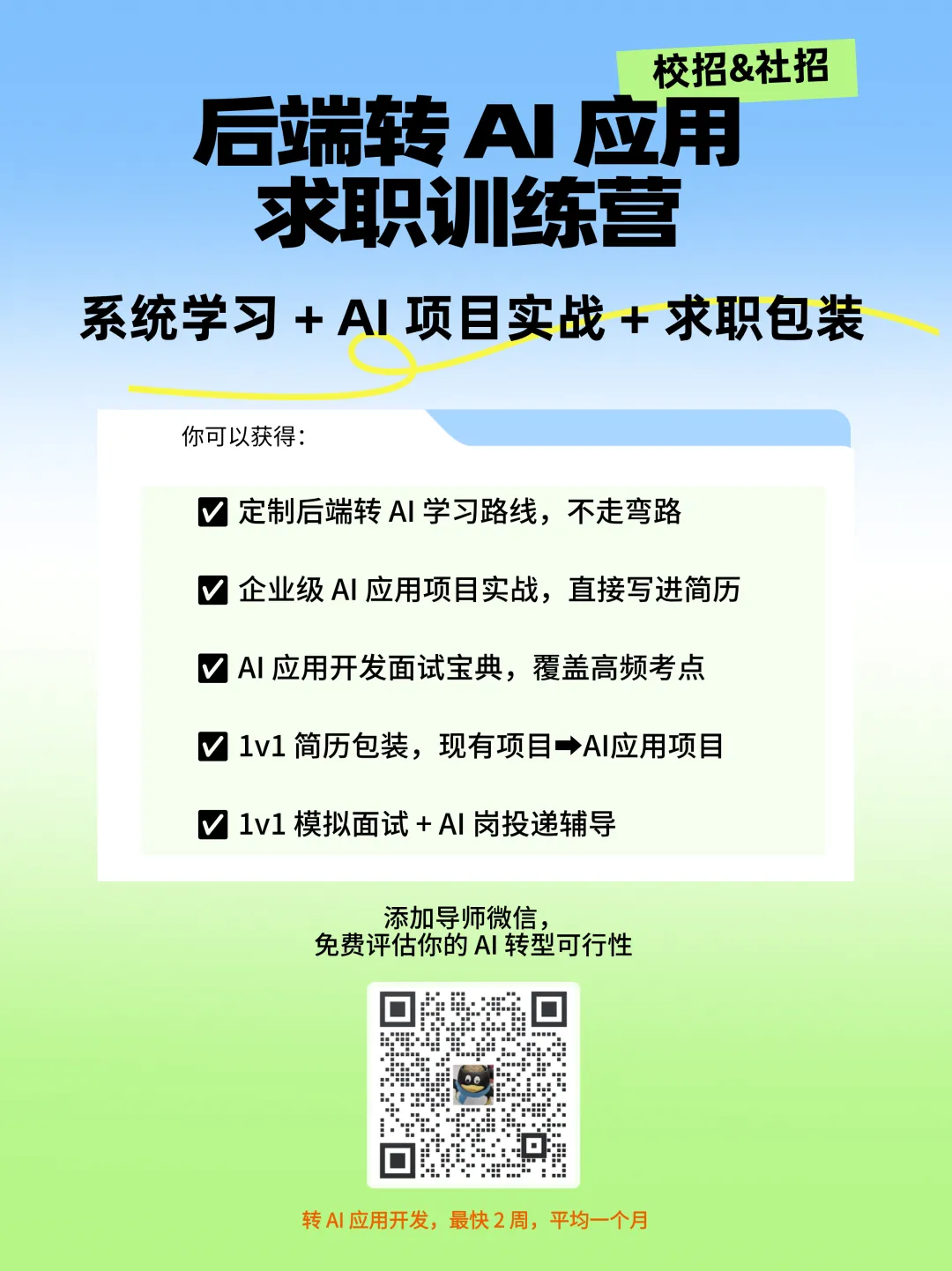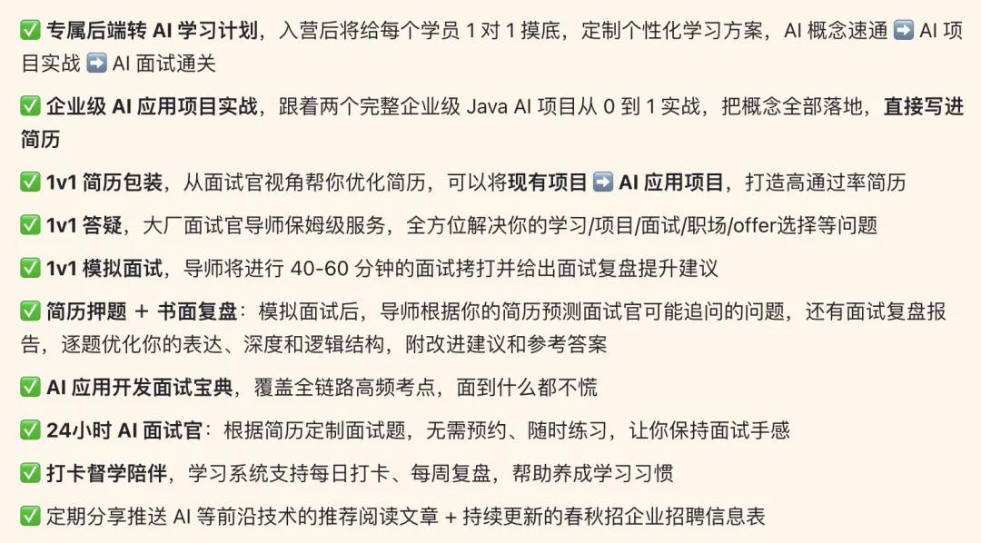 所以我们决定,将后端求职训练营全面升级为「AI 大模型全栈开发训练营」。从 AI 概念速通 ➡️ 企业级 AI 项目实战 ➡️ AI 面试通关,手把手带你转型 AI,拿下高薪 offer。