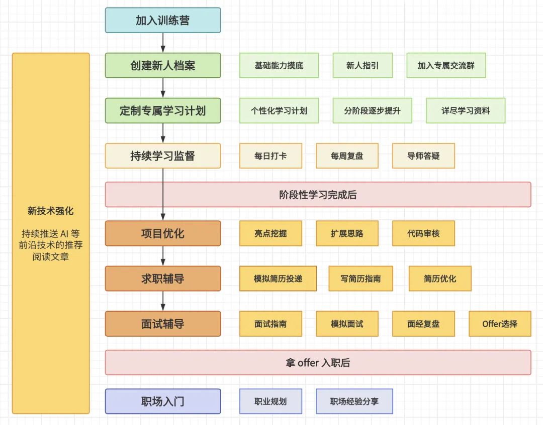 更重要的是,训练营提供的是从编程基础、开发能力到面试求职、职场入门的全流程能力提升,既能提升你的底层能力,也直接面向 offer。