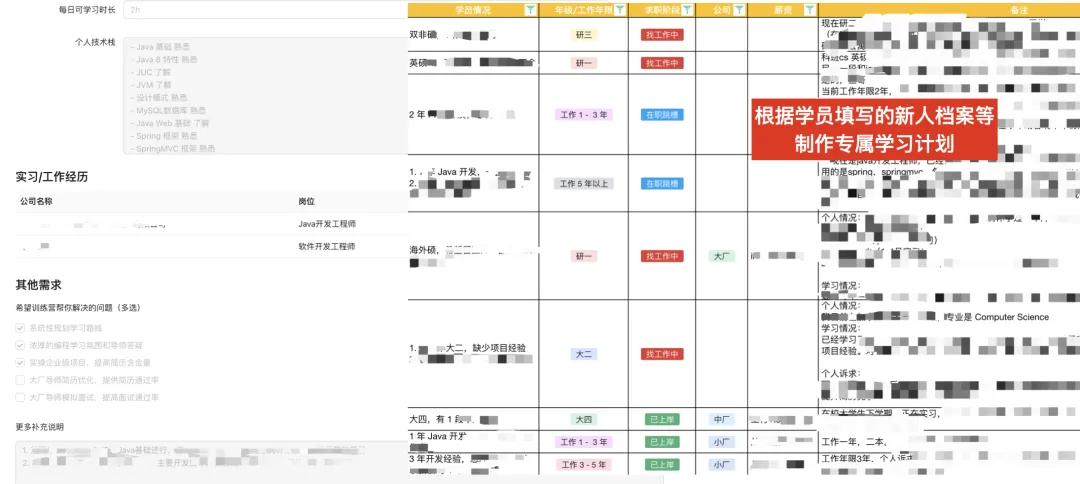 训练营不是集中开班授课,以 自学 + 答疑辅导 + 监督陪伴 为核心,定制化学习路线 + 详尽学习资料 + 改简历改项目模拟面试等 1v1 服务,时间安排更自由,内容更个性化。
