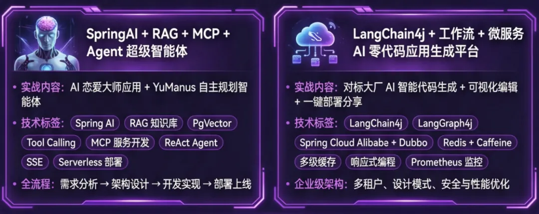 训练营提供 两个完整的企业级 Java AI 项目,从 0 到 1 手把手带你实战,可以直接写进简历!