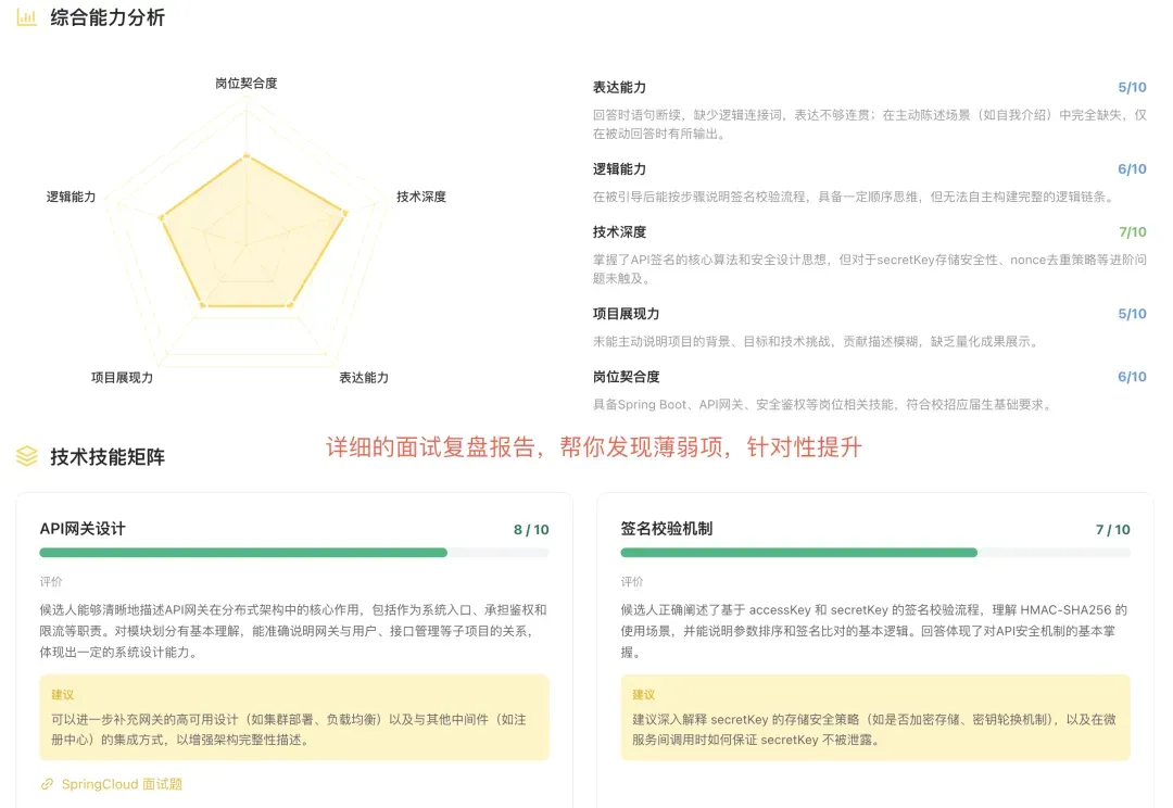 模拟面试结束后,导师还会根据你的简历内容定制化预测面试官可能追问的问题,逐题帮你优化答案的表达、深度和逻辑结构,附上改进建议和参考答案,你可以反复回看,当作面试前的复习材料。