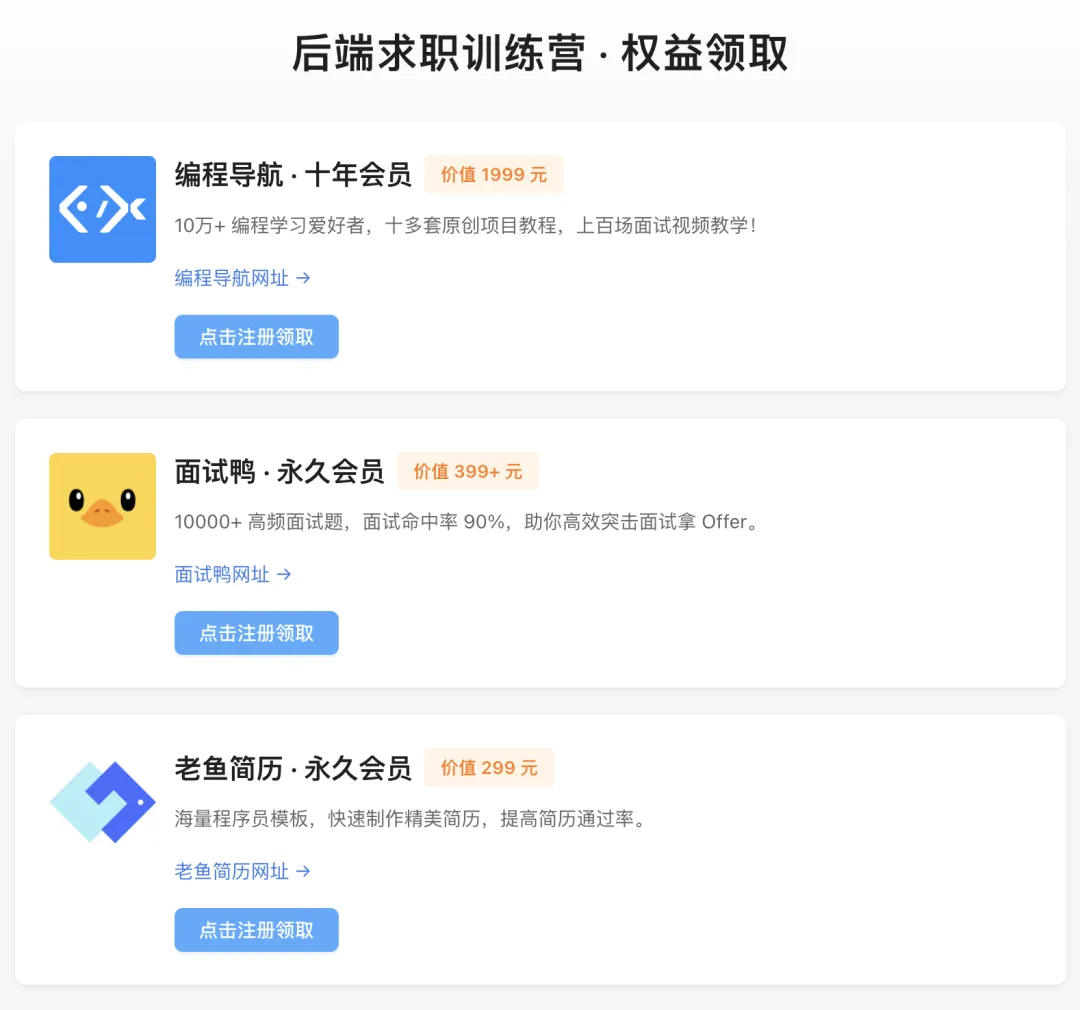 尤其是简历中缺乏项目经验的校招同学,都可以在这里找到合适的项目武装自己,增加你的面试邀约。这些都是帮助过成千上万名编程导航鱼友拿下 offer 的高含金量 offer,并且后续更新新项目还能继续学习。