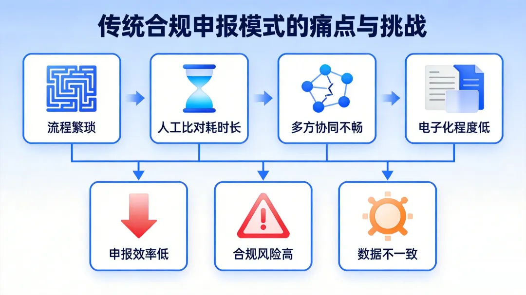 传统合规申报模式存在流程繁琐、人工比对耗时长、多方协同不畅、电子化程度低等痛点,易导致申报效率低、合规风险高、数据不一致等问题。