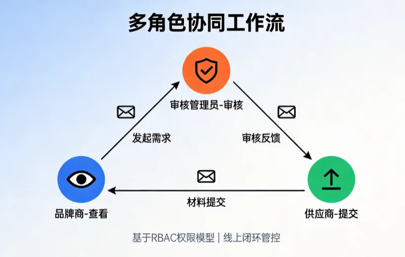 1. 多角色协同工作流 基于RBAC权限模型,实现品牌商、供应商、审核管理员三类角色协同,线上闭环管控,邮件实时提醒。