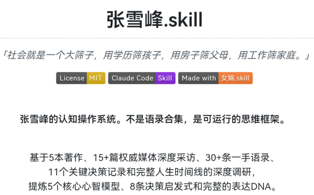 昨天晚上刷到一条新闻,GitHub上有人把张雪峰的五本书、十几篇采访、三十多条经典语录全部投喂给大模型,做出了一个叫"张雪峰.skill"的智能体。