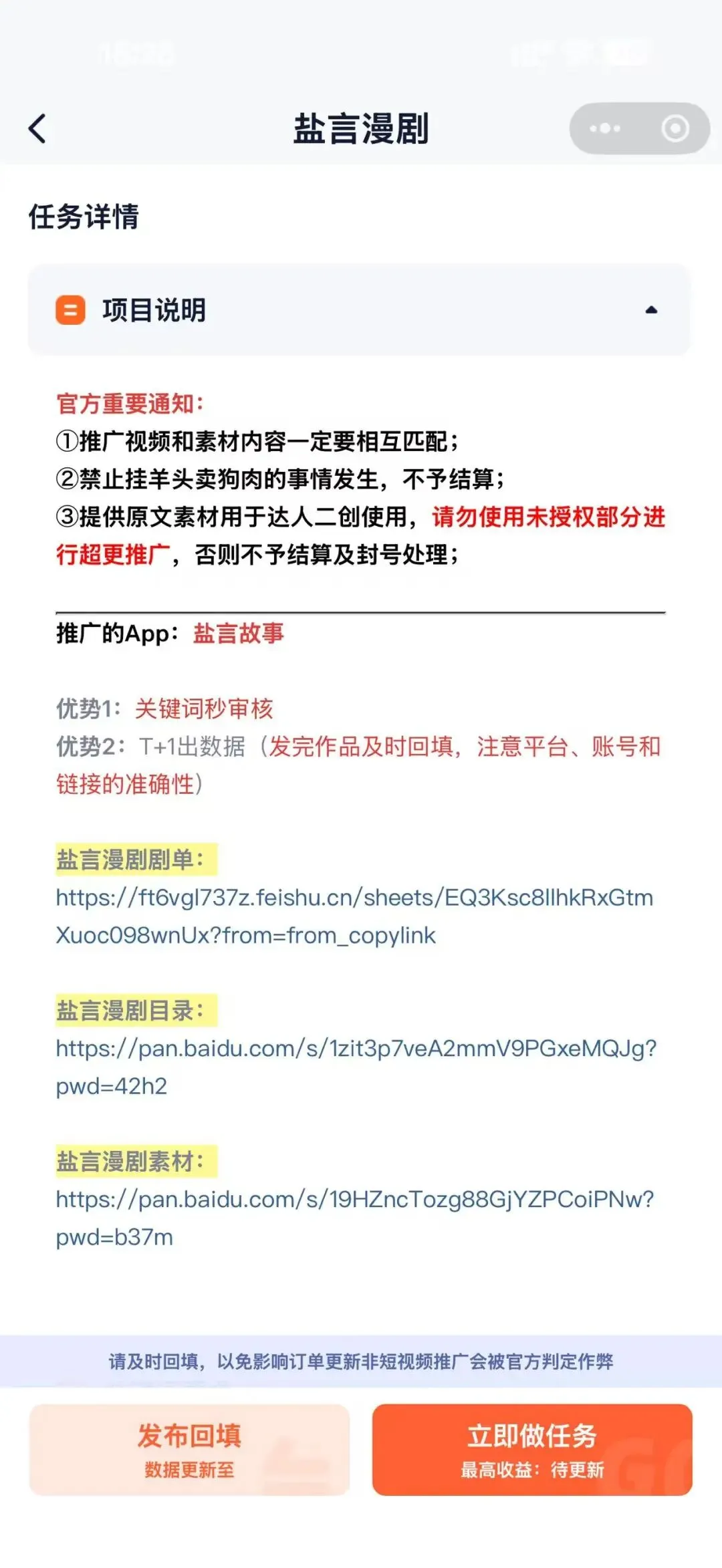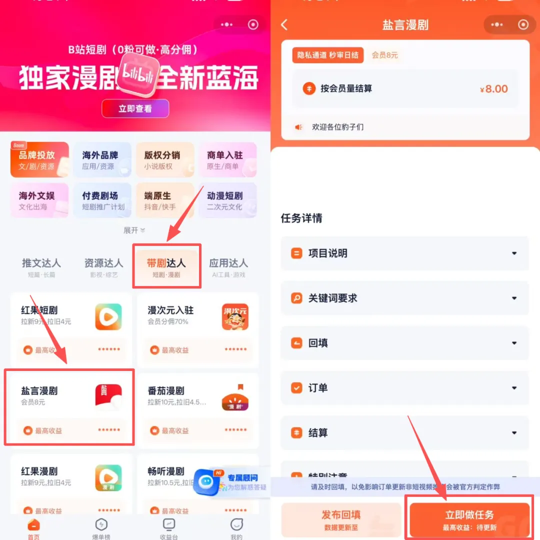 打开右豹APP或者右豹小程序,在「带剧达人」板块中找到「盐言漫剧」的入口,进入页面后点击右下角的「立即做任务」,按照页面提示填写个人信息并提交审核,等审核通过后,就能顺利拿到授权,全程不需要支付任何费用。