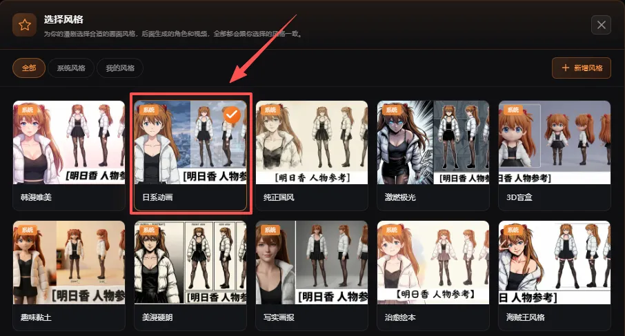 点击「创建项目」,将小说原文复制粘贴到指定区域,选择自己喜欢的画面风格和视频模型,