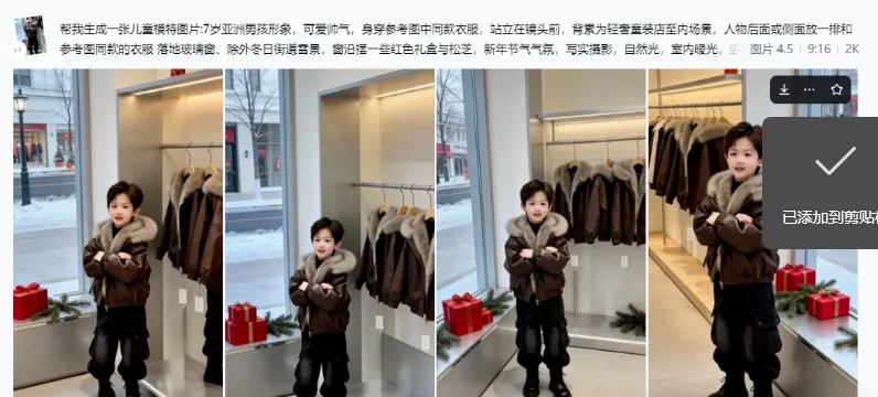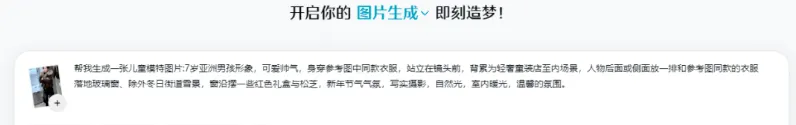 第二步,打开即梦APP,导入准备好的童装平铺图作为参考,输入对应的提示词,就能生成符合预期的AI童装模特;