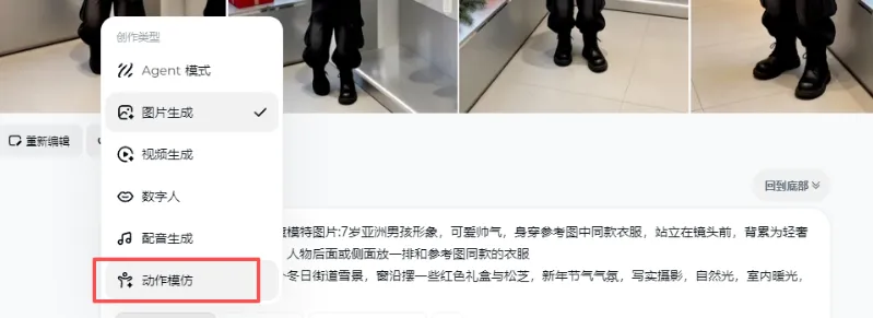 第三步,运用即梦的动作模仿功能,上传一段跳舞视频模板,点击一键生成,一段AI童装跳舞带货视频就制作完成了。