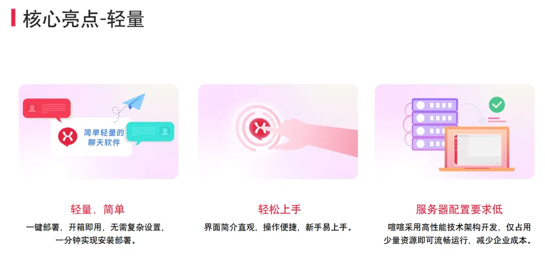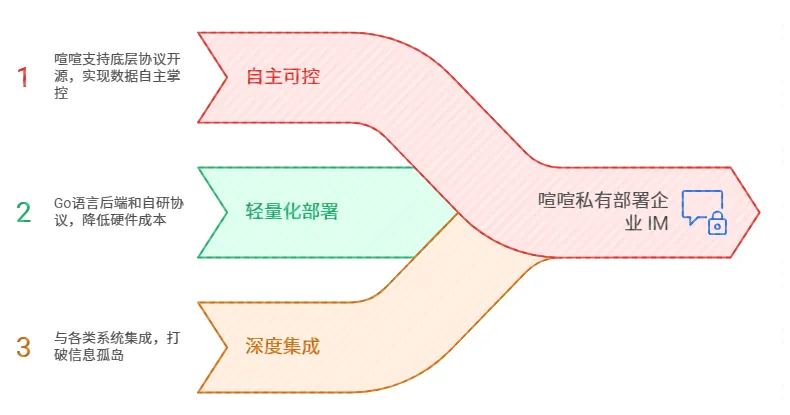 第二看资源投入产出。不想承担高额硬件和运维成本的企业,轻量化的喧喧比重型私有化 IM 更具实用性。