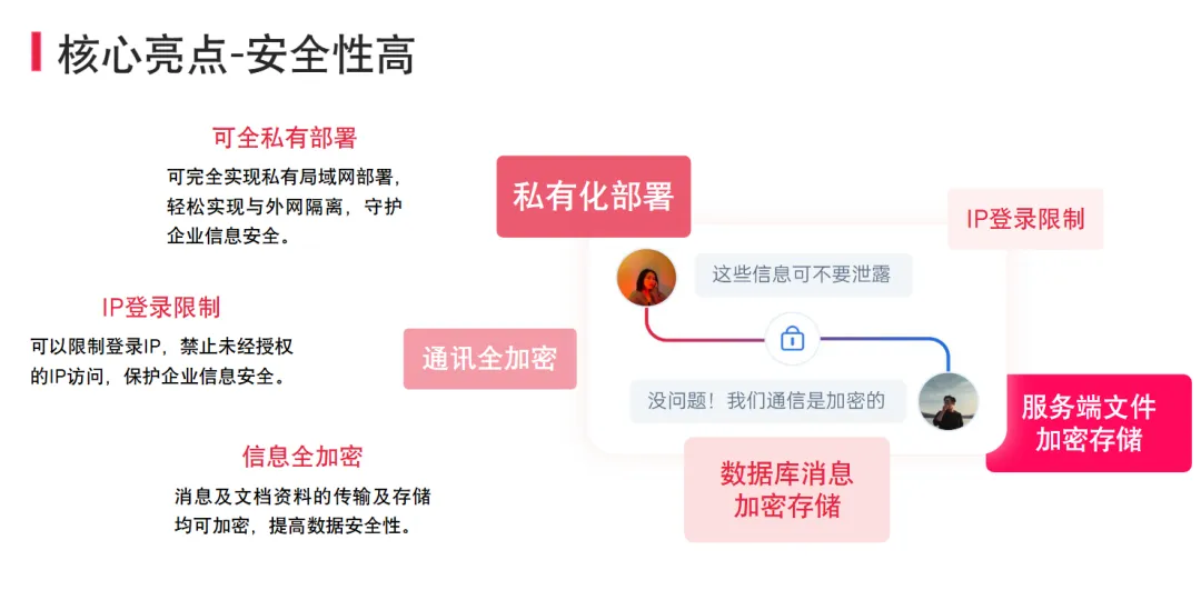自主可控是喧喧的核心安全优势。对保密要求严苛的单位来说,软件黑盒架构会带来不可忽视的安全隐患。产品在物理内网环境运行时,所有数据都留存于本地机房,不会出现任何数据外发的情况,真正实现企业数据自主掌控。