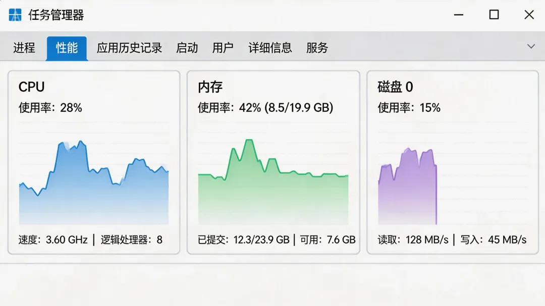 打开任务管理器(Ctrl+Shift+Esc),看看内存占用率。如果经常超过80%,你的电脑就是在"喘着气干活"。
