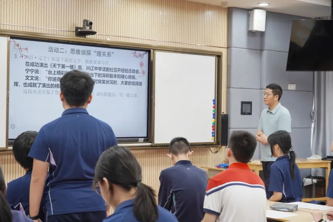 随后,语文科组蔡云峰老师带来《握紧“金钥匙”,开好“头一枪”——材料作文的审题立意》一课。课堂上,蔡老师精准诊断当前学生写作的痛点与困惑,通过真实习作案例引发学生共鸣。随后,他化繁为简,为学生系统讲授材料作文写作的实用路径,凝练为三大核心步骤:“火眼金睛抓题眼,思维侦探理关系,立意大师定中心”。 整堂课方法清晰、逻辑严密,引导学生从“畏难”到“有法”,为写出高分作文打下坚实基础。
