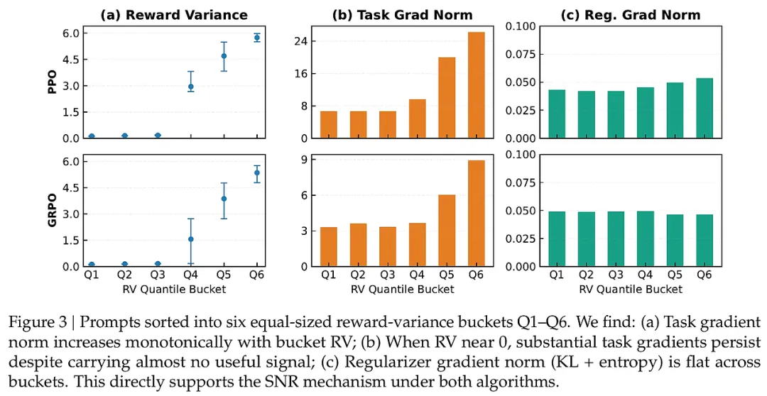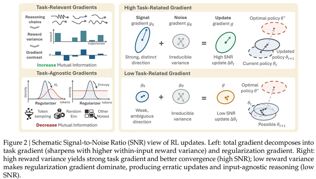 2. 机制解释:信噪比(SNR)视角的梯度解构 为什么模型会产生模板坍塌?研究者通过梯度分解给出了一个极具洞察力的解释。在RL更新中,总梯度由“任务梯度(信号)”和“正则化梯度(噪声)”组成。