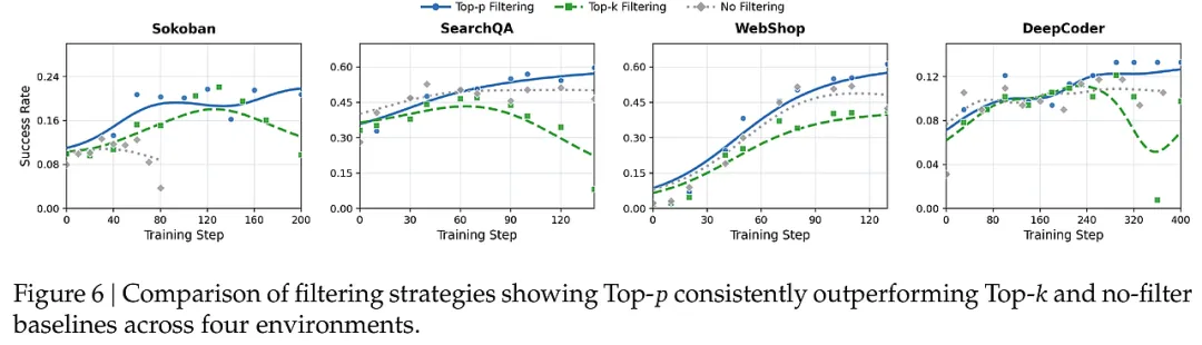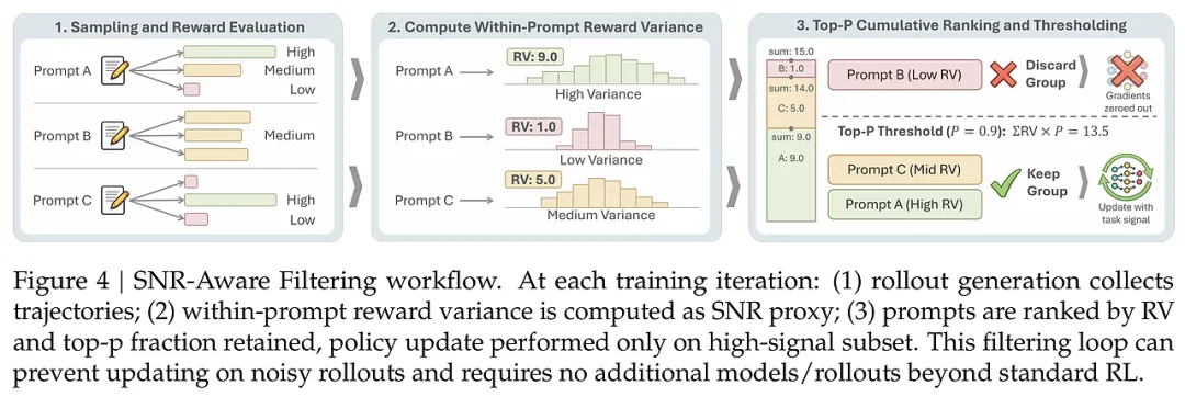 3. 干预策略:信噪比感知过滤(SNR-Aware Filtering) 基于上述发现,研究者提出了一种轻量级且高效的干预手段。在每一次训练迭代中,不再盲目地利用所有数据进行更新,而是先计算每个提示词(Prompt)下的奖励方差。 团队采用了类似“核采样(Nucleus Sampling)”的逻辑,实施Top-p 过滤:仅保留那些奖励方差较高、即“信号强度”达标的提示词进行参数更新。这种方法就像是在嘈杂的电波中只截取清晰的信号段,有效地防止了低质量、高噪声的更新对模型推理逻辑的侵蚀。更精妙的是,这种方法通过重新分配计算预算(增加单提示词的采样数,减少提示词总量),在不增加总计算量的前提下,显著提升了训练的稳定性。