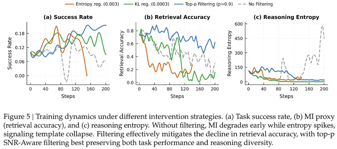 定义了新问题:识别了掩盖在多样性表象下的“模板坍塌”模式。 提供了新工具:开发了无需额外模型的互信息估算代理指标。 发现了新机制:从梯度动力学角度揭示了低信噪比导致推理退化的原理。 实现了新突破:提出了 SNR 感知过滤算法,全面提升了多任务场景下的训练效率。