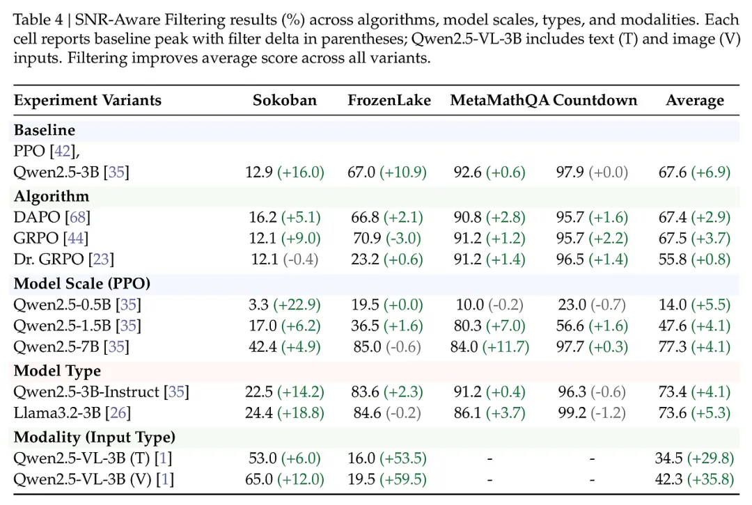 其次,在性能提升上,SNR-Aware Filtering 在所有算法(PPO, GRPO, DAPO等)、所有模型规模(从0.5B到7B)以及不同模态(纯文本与多模态VL)下均表现出显著的增益。特别是在具有挑战性的 FrozenLake 任务中,该方法将成功率提升了超过50%。