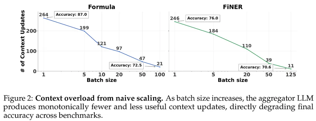 当我们将视野投向大规模并行智能体系统时,挑战接踵而至。研究团队发现,简单地增加并行处理的批次大小(Batch Size)会导致严重的“上下文过载”现象:负责汇总经验的 LLM 在面对海量反馈时,会像处理过载信息的经理一样,变得只会说“注意细节”之类的废话,而丢失了那些真正能提升性能的高价值特定策略。这种“平庸化”导致性能大幅下滑,在 Formula 等复杂任务中,准确率甚至会从 87% 暴跌至 72.5%。因此,如何在大规模并行环境下,既能跑得快(高效率)又能学得精(高质量),成为了智能体自我进化领域亟待解决的“规模化悖论”。