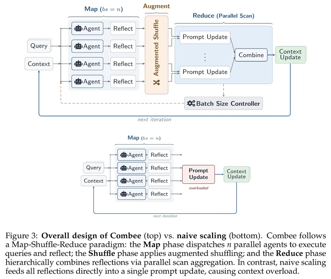 Combee 框架的提出,旨在打破上述“规模化悖论”。它借鉴了分布式计算中的经典思想,并将其巧妙地嫁接到智能体学习流程中,构建了一套名为 Map-Shuffle-Reduce 的新型范式。以下是其核心技术创新的深度解析: